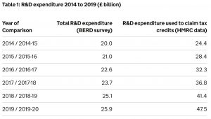 A disturbing chart in HMRC’s latest report (above) shows that the gap between HMRC data and ONS’s Business Enterprise Research and Development Survey (BERD) increased to over £20bn in 2019-20.
